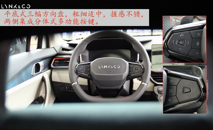 内饰方面,领克06的中控台很有层次感,且还采用了不同颜色的设计,悬浮式中控屏、液晶仪表、电子挡杆等配置,进一步提升车内科技氛围。空调面板非常简洁,采用了触控式的操作方式,整体非常新颖。