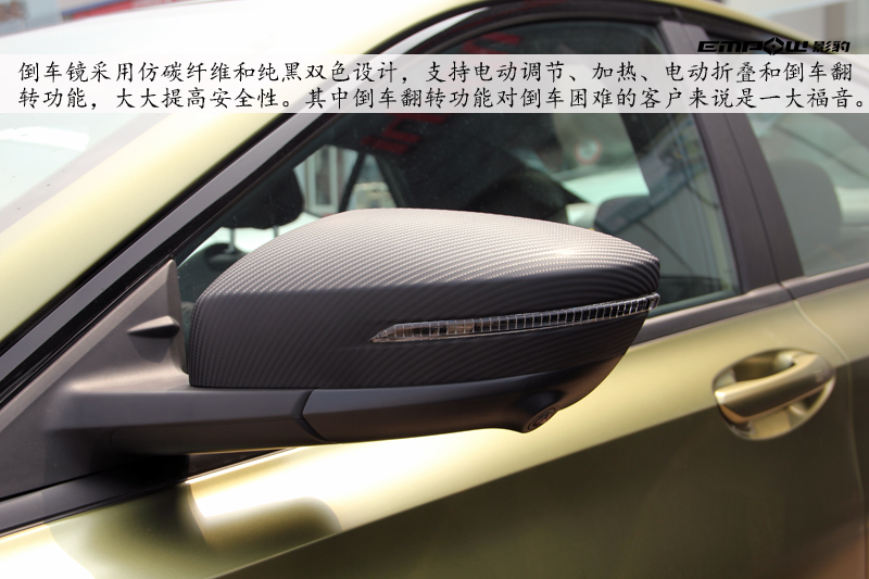 倒车镜采用了双色设计,仿碳纤维和纯黑搭配,支持电动调节、加热、电动折叠和倒车翻转功能,大大提高安全性。其中倒车翻转功能对倒车困难的客户来说是一大福音。