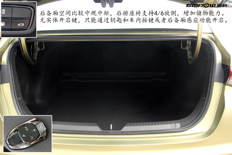 后备厢空间比较中规中矩,后排座椅支持4/6放倒,增加储物能力。由于没有实体开启键,只能通过钥匙和车内按键或者后备厢感应功能开启。