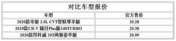 对比车型选择了2020款奇骏 2.0L CVT智联尊享版、2019款CR-V 耀目Plus版240TURBO 和2020款昂科威 20T两驱豪华版在很多网站上评分和关注度都较高,且均为两驱顶配版的官方指导价都在20万左右,这对于购买合资SUV车型的消费者来说,是非常有吸引力的。三款车目前均有不同程度的优惠哦!