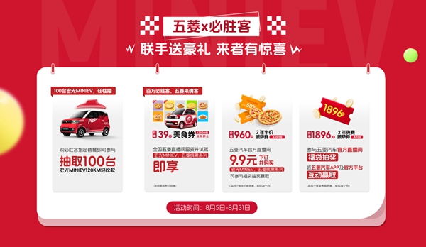 2024年8月5日,五菱汽车与知名餐饮品牌必胜客正式官宣联名,打造“人民五菱,必胜之选”五菱×必胜客联名季,8月5日至8月31日,五菱汽车将提供100辆宏光MINIEV轻松款进行抽奖,到店试驾购车更可瓜分价值百万元的必胜客美食券,此次双方联手,将为用户带来快乐出行×缤纷美味的惊喜福利!