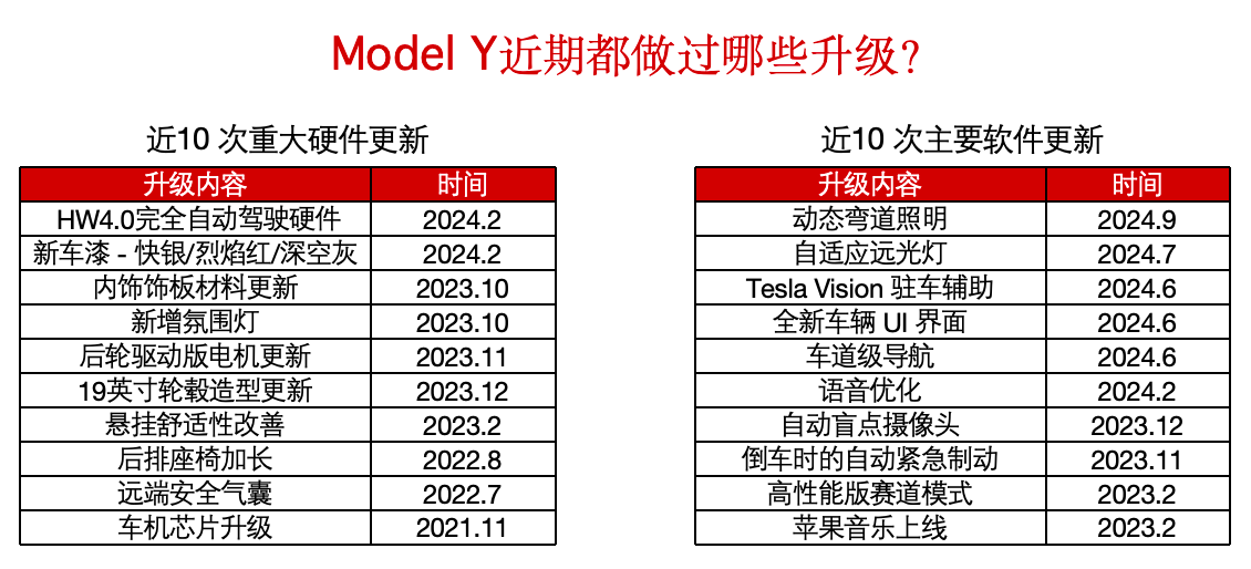 硬件上,今年,Model Y在智能、座舱、性能等方面刚刚进行了全面的产品升级,搭载多色氛围灯、标配远端安全气囊、可选全新车漆“快银”,还有更新设计的19英寸双子星轮毂等外观升级。同时,Model Y后轮驱动版百公里加速能力,相比此前车型提升1秒,足以媲美大部分燃油超跑。