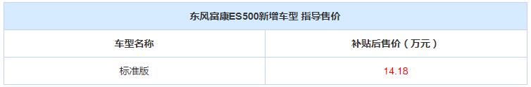【车家网 报道】日前,我们从东风富康官方获悉,旗下ES500新增车型正式上市,新车共推出1款车型,售价为14.18万元。新车定位为紧凑型纯电动轿车,外观与现款保持不变,但性能有所提升,NEDC续航里程由现款的401km增加至420km。详细车型见下表: