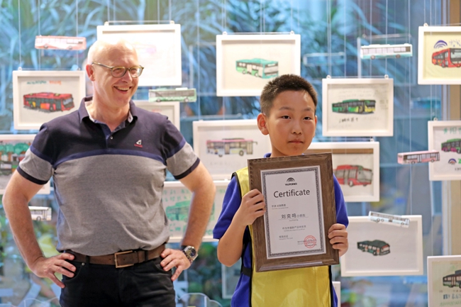 今年六一儿童节来临前夕,刘奕鸣终于在宇通客车实现了自己的心愿。在宇通客车,他不仅举办了以公交车为主题的个人画展,参观了宇通客车生产车间,还得到宇通客车设计总监Mathias Lenz帮他讲解一辆公交车从设计草图到生产制造的过程,并收到Mathias Lenz亲笔签名的公交设计草图,并成为宇通客车的小“产品体验官“