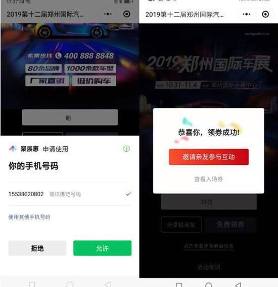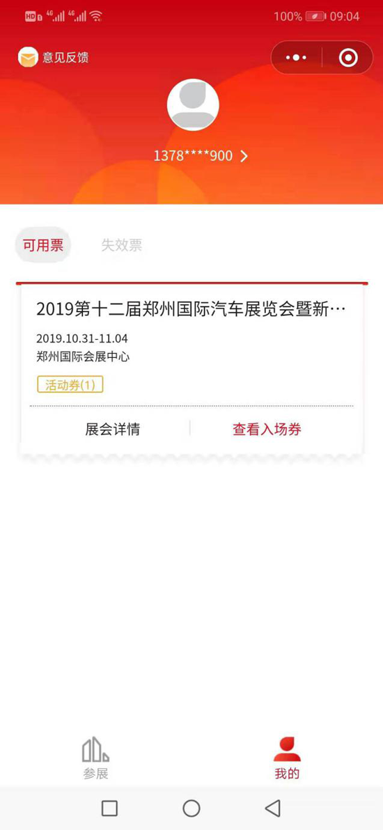 2、输入手机号和验证码点击登录,即可领取到免费的郑州国际车展门票;点击“查看入场券”,即为车展电子门票,展期扫码入场即可。