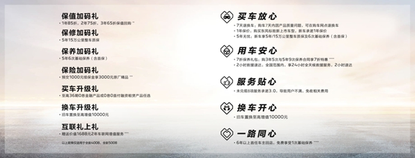 具体包括:1年85折,2年75折,3年65折保值回购的“保值加码礼”;5年15万公里整车质保的“保修加码礼”;5年6次基础保养(含首保)的“保养加码礼”;预交1000元续保金享3000元原厂精品的“保险加码礼”,覆盖了客户用车的维保周期,让我们不再为车辆是否保值而担忧。