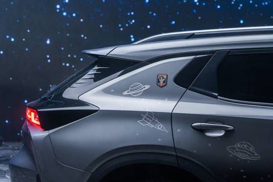 车侧采用浮雕艺术感的米奇太空版专属徽标,并巧妙地融入宇宙、星空等元素