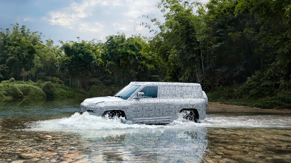 谍照显示,伪装后的R1看起来尺寸相当大,整体车身比例大气稳重,线条简约硬朗,加上造型方正的外轮廓,整车气势十足。R1车头较长,并且采用粗犷的轮眉设计,从正面和侧面都营造出体量感和安全感。从涉水场景谍照推测,R1离地间隙相当高,带来更好的通过性能。此外,R1还配备外挂式备胎,更加凸显越野性能。整体而言,R1整车造型十分符合硬派越野的产品定位。