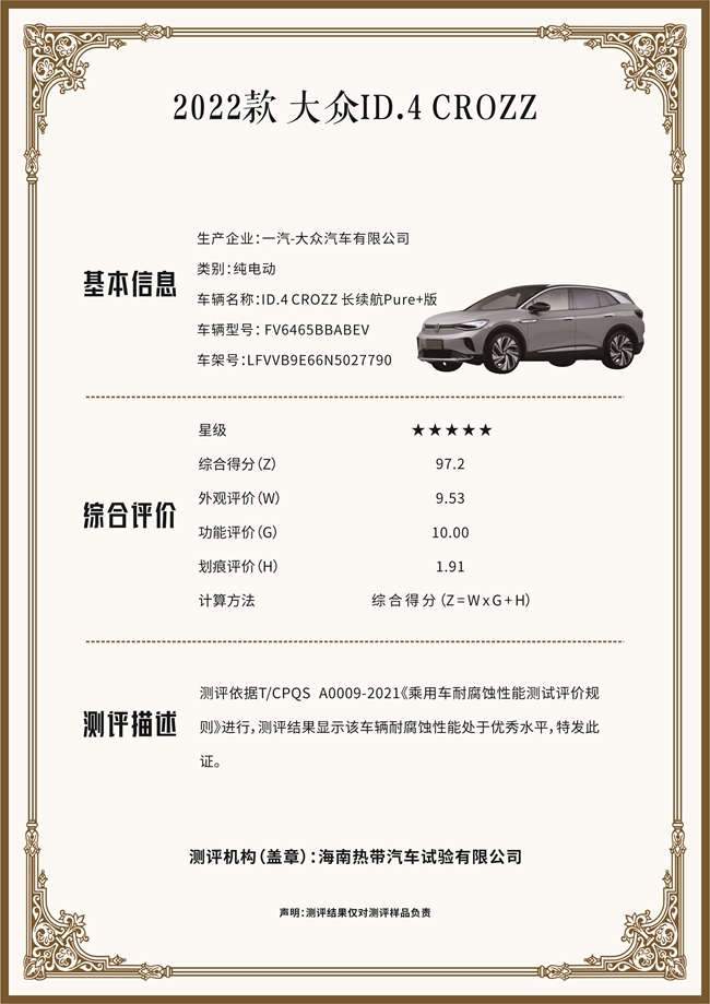 2月14日,中国消费品质量安全促进会在海南发布“CA-CAP耐腐蚀性能测试”首次正式公开测评结果。在该批次所有参评车型中,一汽-大众ID.4 CROZZ以2022年度综合得分最高成绩赢得白金认证,展示了一汽-大众ID. CROZZ系列产品的卓越品质。