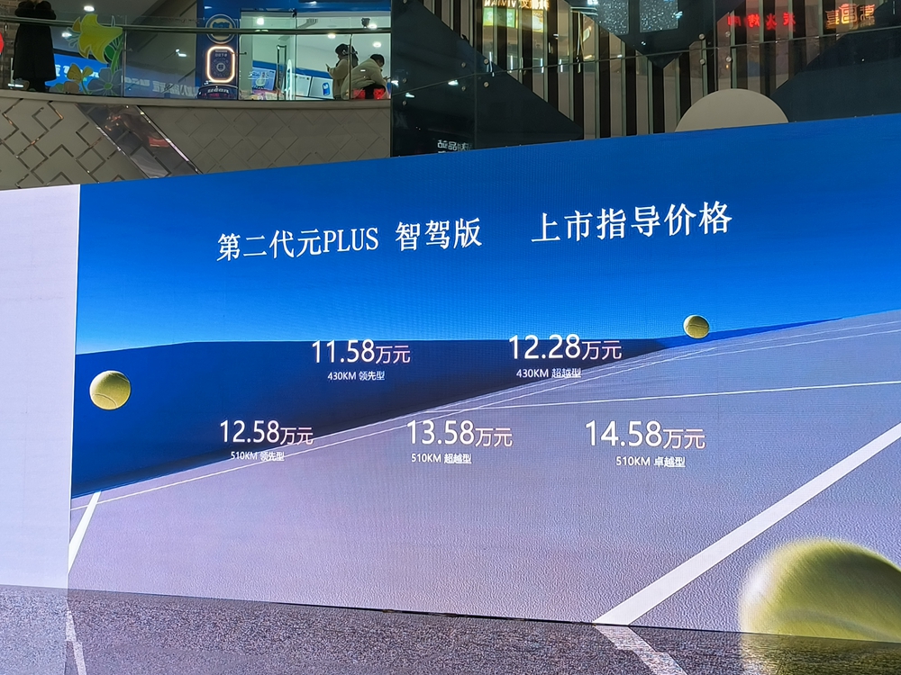 比亚迪第二代元Plus智驾版‌正式上市,共推出3款配置,售价区间为‌14.98万-17.38万元‌。最大功率150kW,匹配容量为49.92kWh、60.48kWh两种容量的磷酸铁锂电池,对应纯电续航里程为430km、510km。