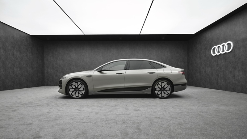 作为电动化设计的经典符号,奥迪 A6L e-tron电池区域通过侧围嵌入式黑色高光饰板形成视觉锚点。横向延展的黑色模块贯穿车身侧面,与车尾反光条无缝衔接,在强化低重心视觉张力的同时,构建出修长流畅的车身比例。奥迪 A6L e-tron还配备第二代流媒体外后视镜、半隐藏式门把手与1.88 m²超大玻璃面积全景天幕,兼顾功能属性和美学价值,让豪华体验再进阶。