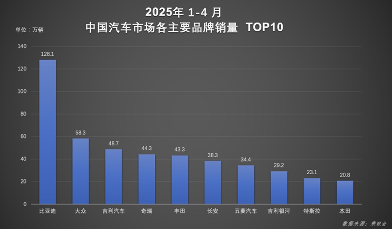 作为季度承上启下的关键节点,4月比亚迪汽车再次以34.7万辆的成绩,位列中国汽车市场各主要品牌销量TOP10第一,几乎等同于第二至四名之和;比亚迪汽车1-4月累计销量超128万辆,同比增幅显著,呈现出强劲的增长动力与市场统治力。